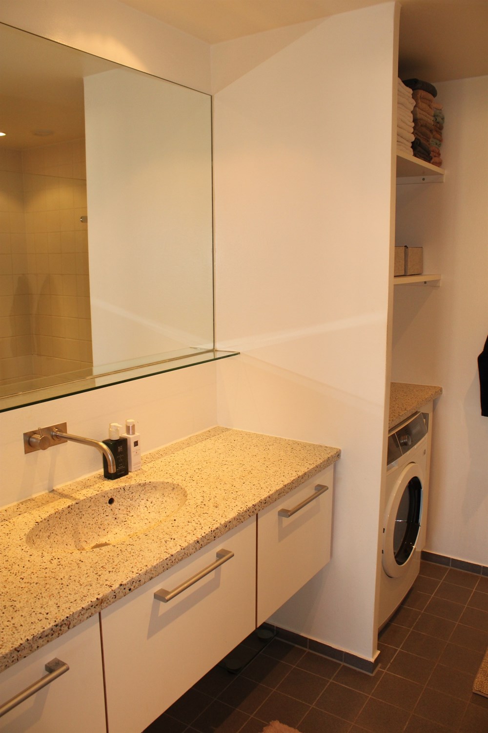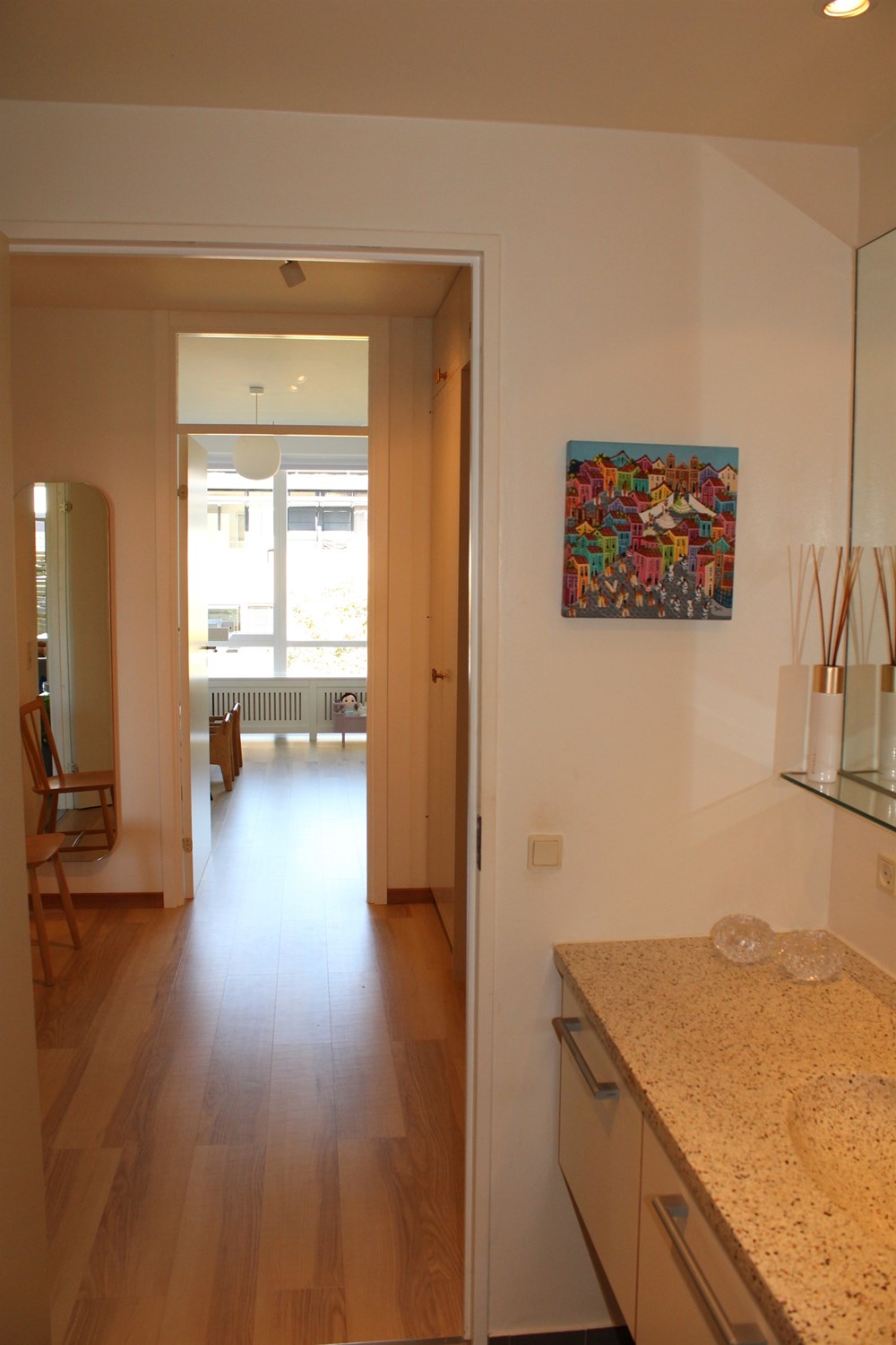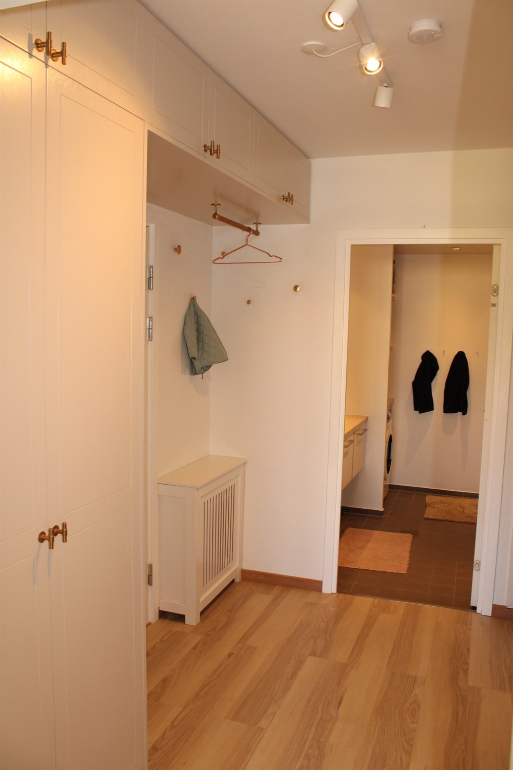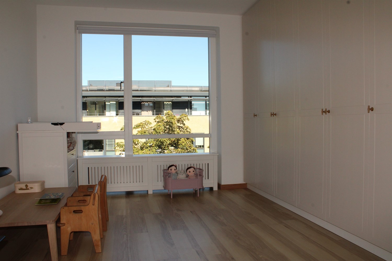 The apartment is modern, and contains a large entrance hall, with plenty of space for outerwear and footwear. The kitchen is open to the large living room, the heart of the home, with nice space for family meals and lots of cozy togetherness. There is plenty of space to arrange yourself with both a dining table and sofa arrangement, and you can also open up to the sunny terrace, as a very nice extension of the rooms, in the summer months.