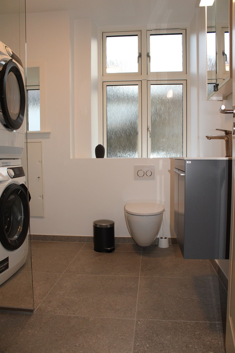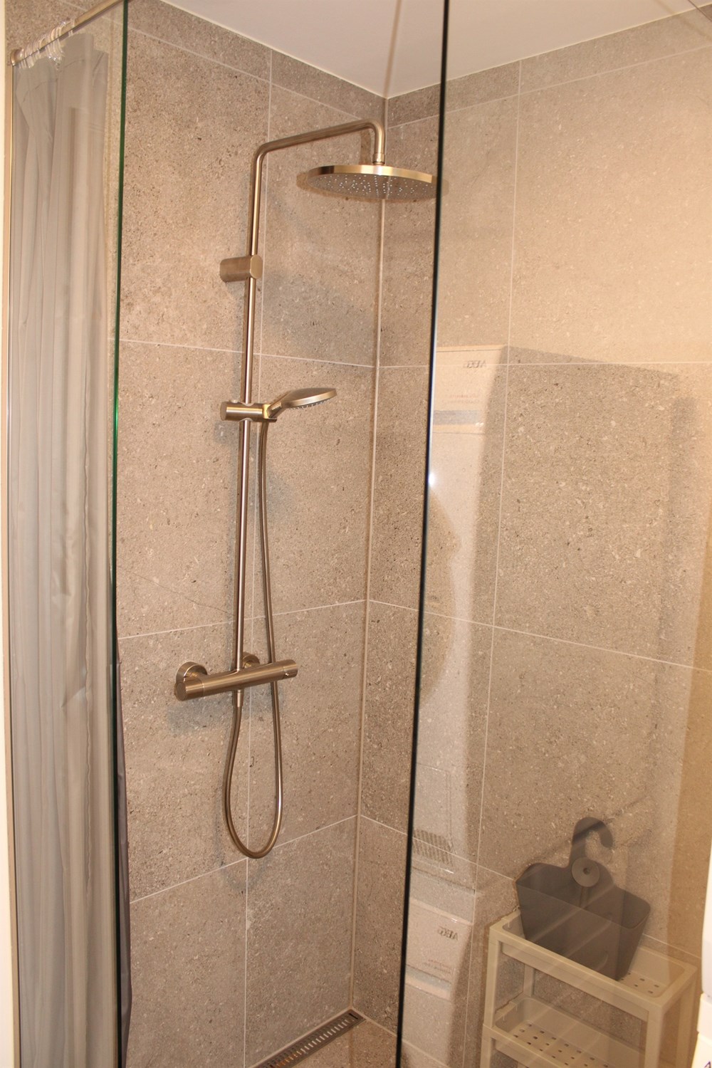 There is a beautiful large bedroom with a big bed and desk, a guest room / children's room, also of good size, and a slightly smaller room, furnished as an office. The bathroom has a good size, with nice rustic gray tiles and washing machine and tumble dryer.