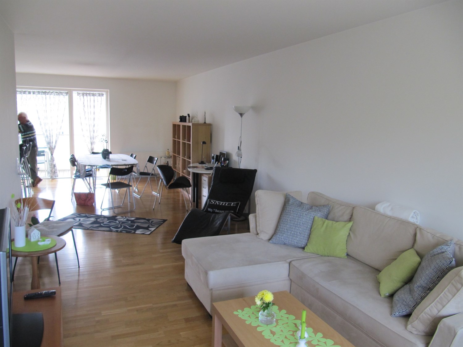 Lejligheden indholder: entré, flot køkken/alrum med åbent køkken og udgang til stor altan, solrig stue med udgang til endnu en altan, et stort soveværelse med indbygget skab, et flot badeværelse med badekar og vaskesøjle, et børneværelse/kontor samt endnu et badeværelse med bruseniche.