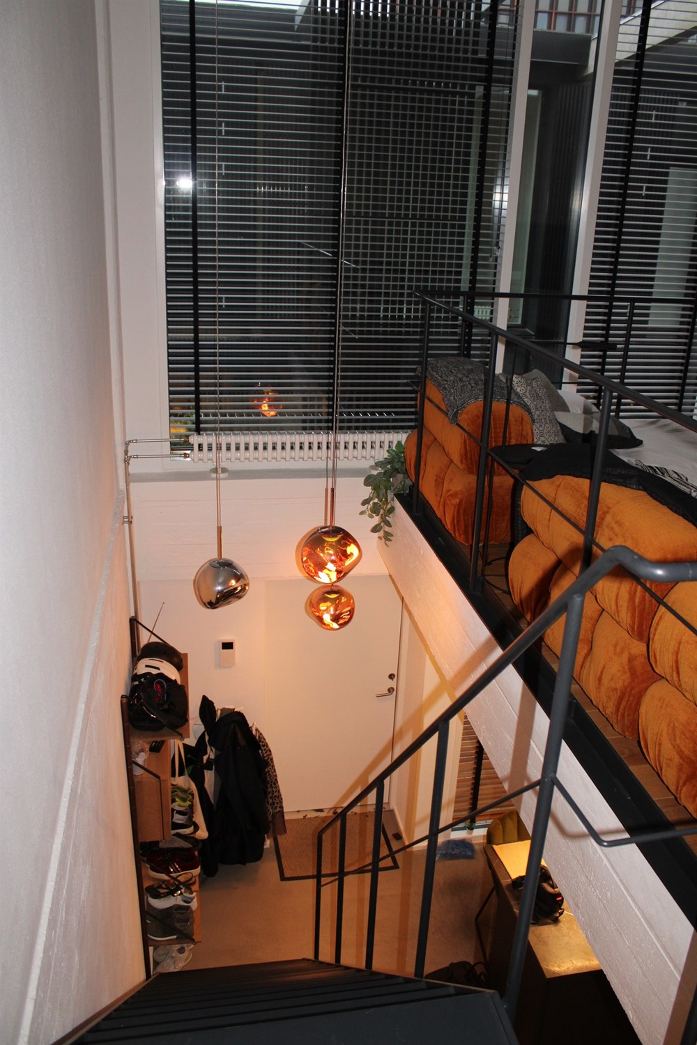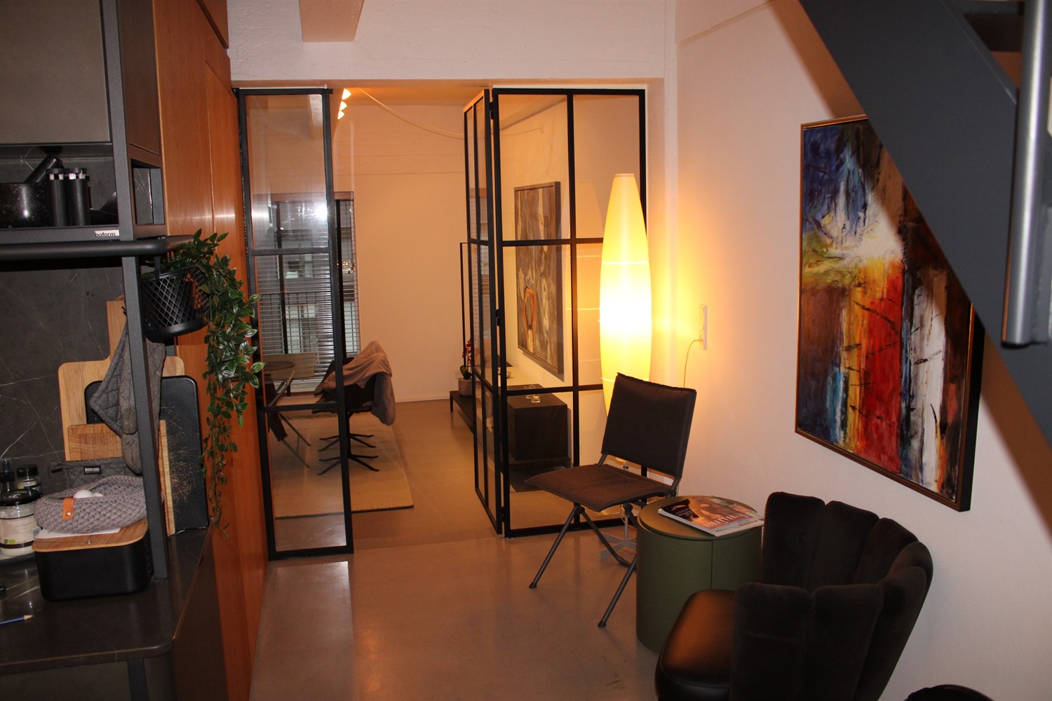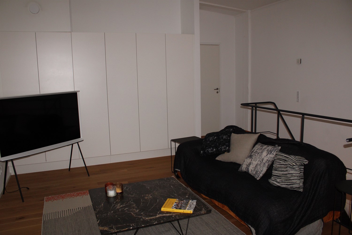 På 1. sal finder du en stor åben stue, med kig til køkkenet i underetagen og med meget høje glaspartier til atriumgården samt et stort soveværelse med dobbeltseng og masser af skabsplads.