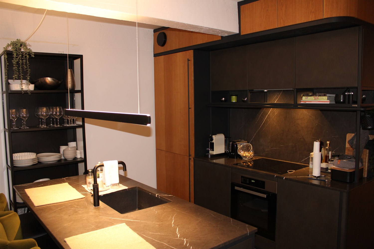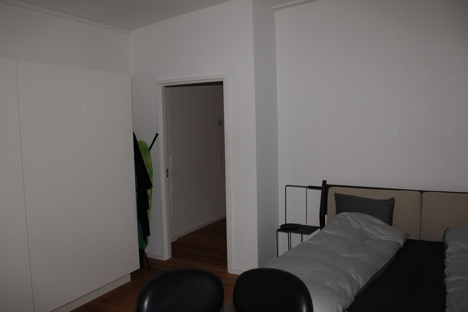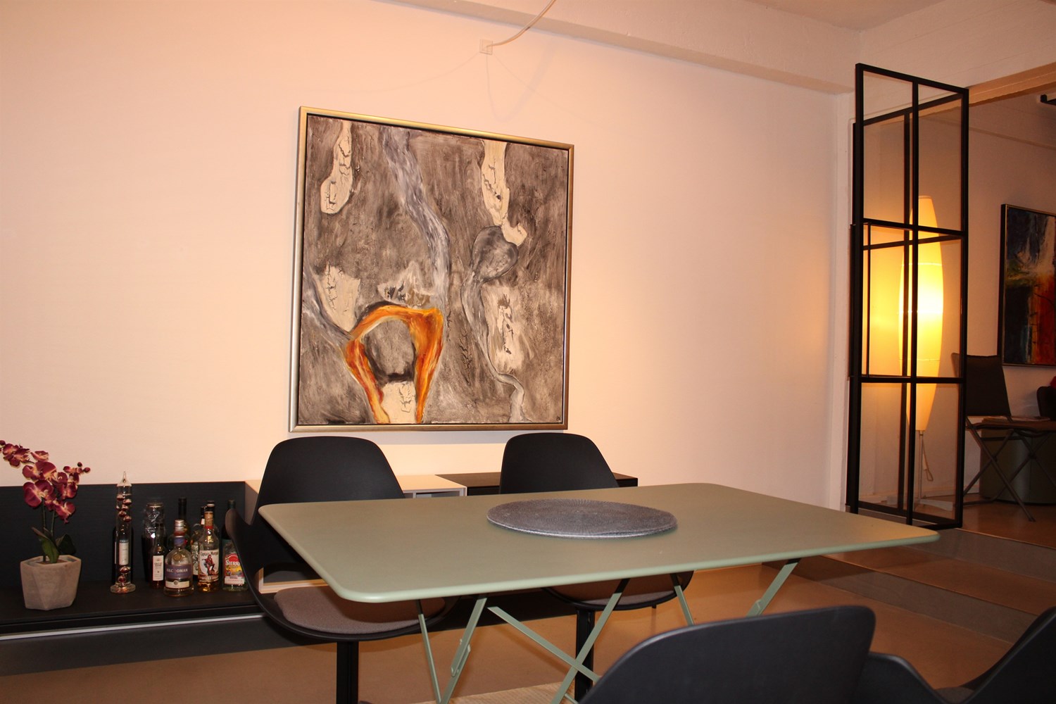 På 1. sal finder du en stor åben stue, med kig til køkkenet i underetagen og med meget høje glaspartier til atriumgården samt et stort soveværelse med dobbeltseng og masser af skabsplads.