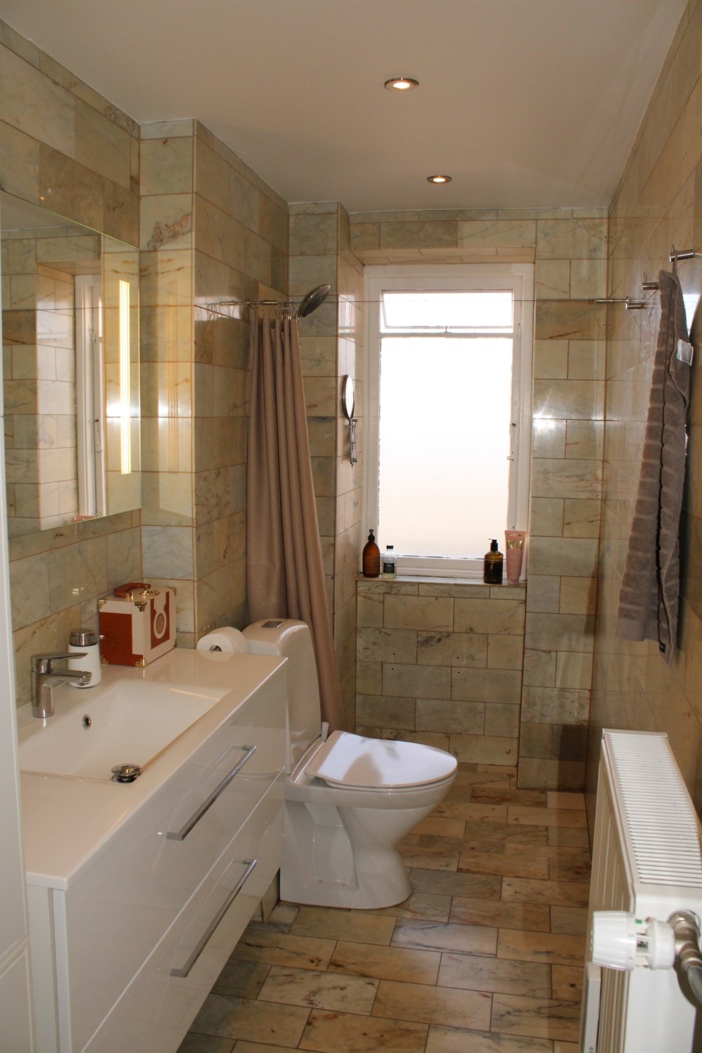 Desuden et pænt stort soveværelse, med skabsvæg og yderligere en altan, et stort badeværelse med bruseniche, entré og et separat køkken med en lille spiseplads. Der er fælles vaskefaciliteter i ejendommens kælder.